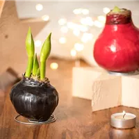 Die Blumenzwiebel der Amaryllis ist sehr groß und macht an sich schon viel her. Deshalb wird die Pflanze gern im transparenten Glas angetrieben. Es gibt dafür speziell geformte Gläser: der obere Teil erinnert an eine Sanduhr, während sie nach unten hin bauchig werden. Die Form ermöglicht es, dass die Zwiebel zwar auf dem Wasser aufliegt, nicht aber darin versinkt. Es muss immer ein Abstand von circa 5 bis 6 Zentimetern zwischen der Wasseroberfläche und der Zwiebel liegen. Am besten nutzen Sie abgekochtes Wasser. Mit der Zugabe von Holzkohle können Sie Fäulnis vorbeugen. Außerdem sollten Sie das Wasser regelmäßig austauschen. So haben Sie über die Festtage eine herrliche Weihnachtsdekoration und auch im nächsten Jahr müssen Sie nicht darauf verzichten.